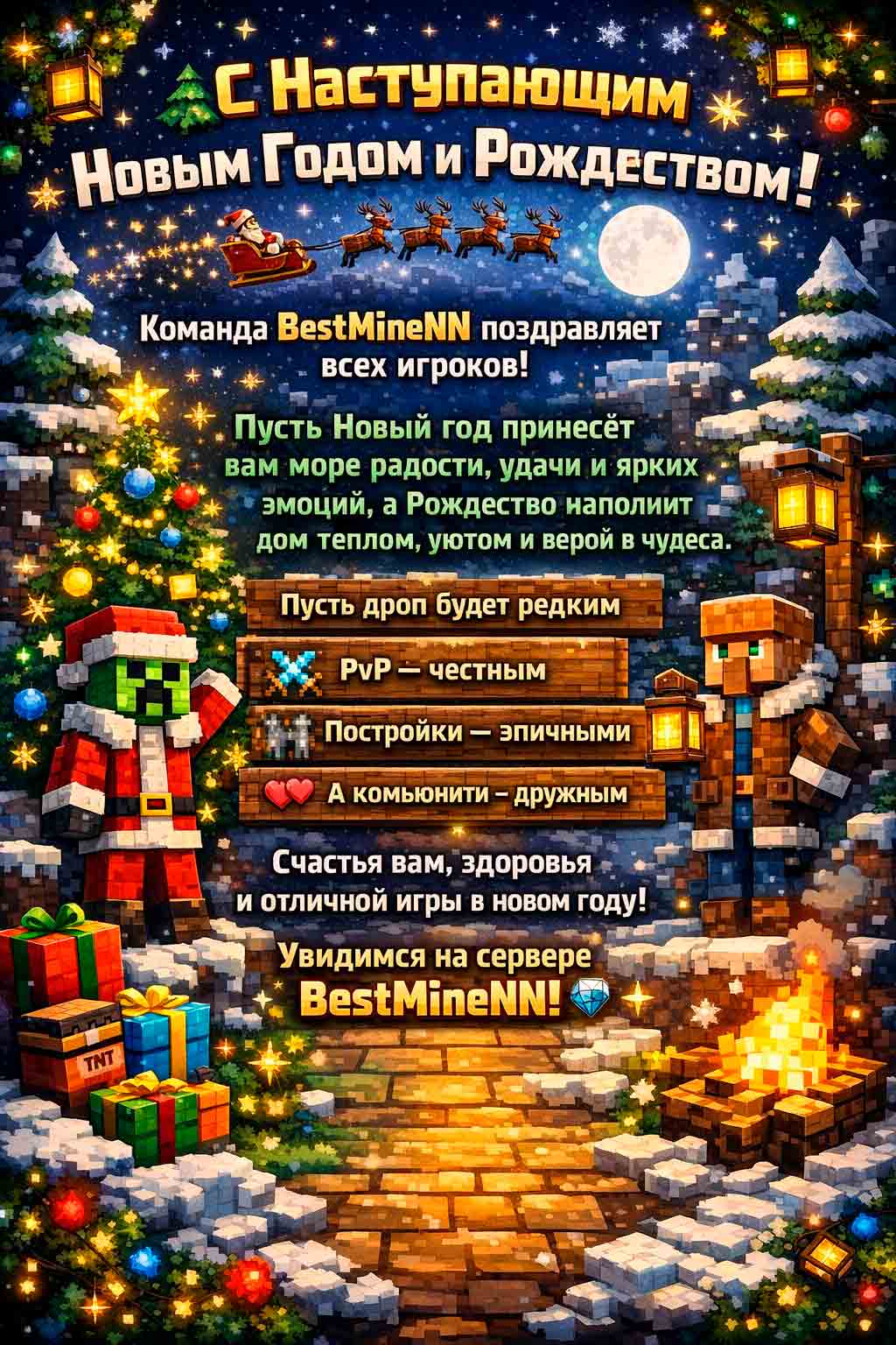 🎄✨ С Наступающим Новым Годом и Рождеством! ✨🎄 Команда проекта BestMineNN поздравляет всех игроков с наступающими праздниками! Пусть Новый год принесёт вам море радости, удачи и ярких эмоций, а Рождество наполнит дом теплом, уютом и верой в чудеса. Спасибо, что вы с нами, развиваетесь, строите, побеждаете и делаете BestMineNN лучшим игровым сервером Minecraft! 💎 Впереди вас ждут новые обновления, ивенты, возможности и ещё больше незабываемых приключений. 🎁 Пусть дроп будет