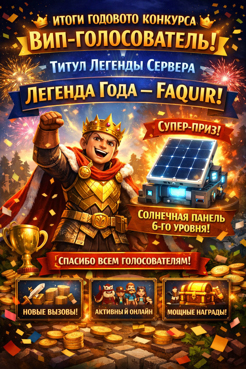 👑 Итоги ГОДОВОГО конкурса «ВИП-ГОЛОСОВАТЕЛЬ» 👑 🏆 ЛЕГЕНДА СЕРВЕРА — Faquir 🏆 Игрок Faquir стал самым активным и постоянным голосователем за весь год. Это не случайная победа, а результат дисциплины, верности серверу и ежедневной поддержки 💪 Ты показал пример всем игрокам — именно так рождаются легенды!