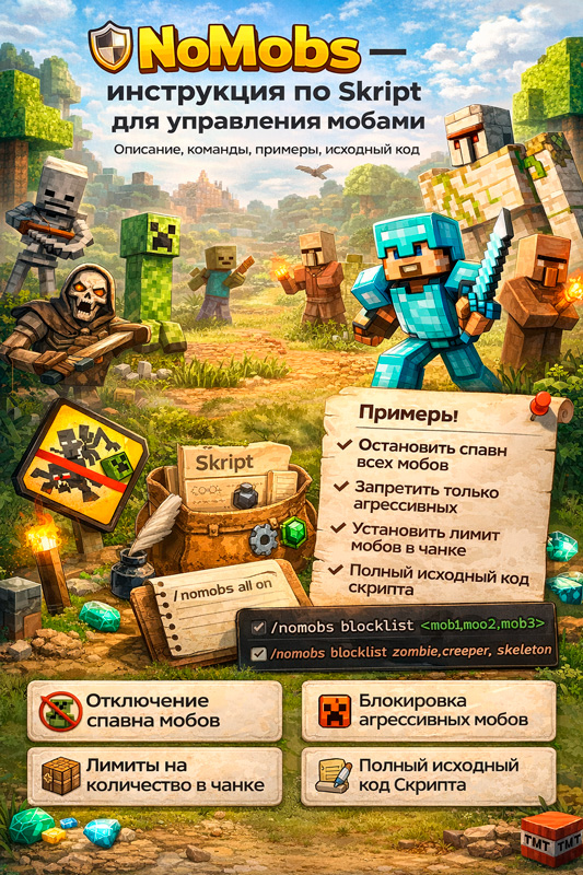 🛡️ NoMobs — инструкция по Skript для управления мобами Подробное руководство по скрипту NoMobs для сервера Minecraft. Здесь собраны: описание возможностей, все команды, примеры использования и полный исходный код.